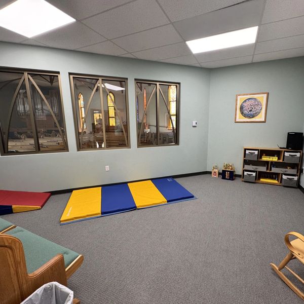 Although we welcome everyone in the sanctuary for worship, some families choose to spend time in here (while still being able to hear what's going on in the sanctuary). A great space to let young bodies stretch their legs!